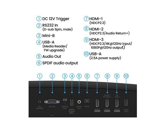 | Inputs: | HDMI x 3 USB Type A x 2 USB Mini B x 1 RS232 x 1 12-Volt Trigger x 1 |