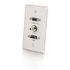 This VGA, HDMI, and 3.5mm aluminum wall plate will allows for both analog and digital video connections to be installed in wall. This wall plate is the perfect solution for running cabling up to a projector for both HD15 and HDMI connections. Feed-through connectors and identification markings make this wall plate simple to install and easy to connect equipment.