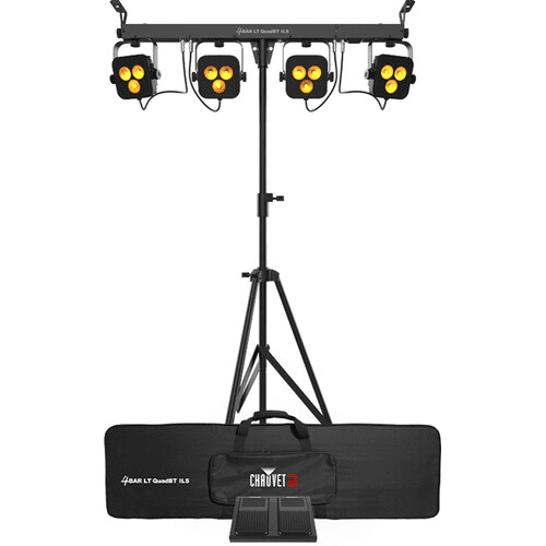 The ILS ecosystem grows with the addition of the 4BAR LT QuadBT ILS, a complete, pack-n-go wash lighting solution with built-in Bluetooth® wireless technology. This quad-color (RGBA) fixture has 4 individually adjustable heads to achieve total room or stage coverage and the color-mixing power of amber LEDs. Easily set up and tear down in seconds with the included tripod, carry bags, and footswitch. 4BAR LT QuadBT ILS is compatible with D-Fi USB for wireless Lead/Follow or DMX programming. 4BAR LT QuadBT ILS safely attaches to truss with built-in bolts, easily increasing mounting options.