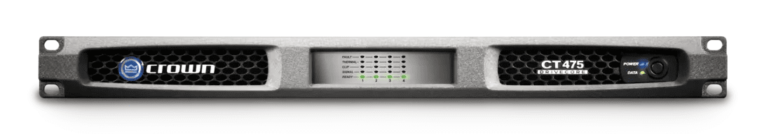 Crown ComTech DriveCore CT475, Four channel, 75W @ 4/8? Power Amp Powering this remarkable amplifier is the pioneering technology of DriveCore™, which integrates the amplifier drive stage into the power output stage fusing everything into a chip the size of a dime. DriveCore's front-end drive circuits leverage the inherent efficiency of Class D output stages while also maintaining superb sonic characteristics. The end result is an audio amplifier circuit that exhibits the exemplary audio quality of a highly evolved Class AB design.