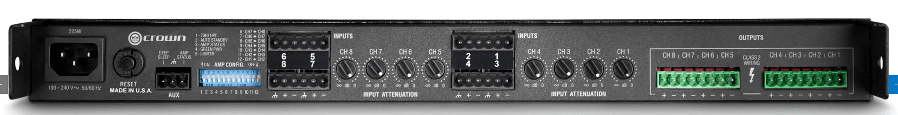 Crown ComTech DriveCore CT875, Eight channel, 75W @ 4/8? Power Amp Powering this remarkable amplifier is the pioneering technology of DriveCore™, which integrates the amplifier drive stage into the power output stage fusing everything into a chip the size of a dime. DriveCore's front-end drive circuits leverage the inherent efficiency of Class D output stages while also maintaining superb sonic characteristics. The end result is an audio amplifier circuit that exhibits the exemplary audio quality of a highly evolved Class AB design.