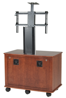 The monitor mount accommodates up to a 50” diagonal monitor, provides 5 degrees of backward tilt, 15 degrees of forward tilt and supports 100 pounds.