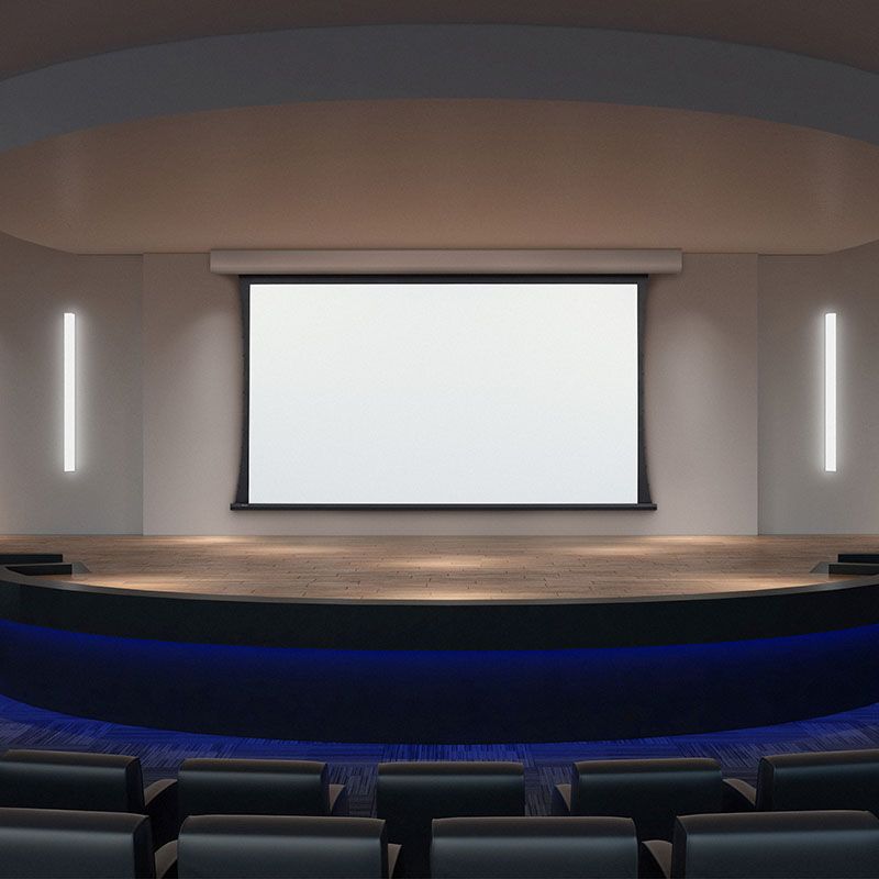 Attractive below-ceiling mounted tab-tensioned electric projection screen accomodating screen widths up to 18' wide.