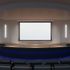 Attractive below-ceiling mounted tab-tensioned electric projection screen accomodating screen widths up to 18' wide.