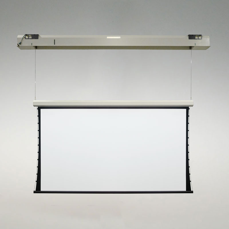 By integrating a screen and lift together into one ceiling-recessed box, the Ropewalker eliminates the need for extra black drop between the screen and high ceilings. With a 34’ (10 m) vertical drop the Ropewalker facilitates the installation of a large, electric screen high above the audience’s line of sight, making it ideal for ballrooms, gymnasiums, houses of worship, and other large venues. Utilizing stainless steel aircraft cables, the viewing surface unrolls from an inner case and the entire screen is lowered to “show” position by an outer case. Safety cables with cable arresters are included that connect the inner and outer cases.