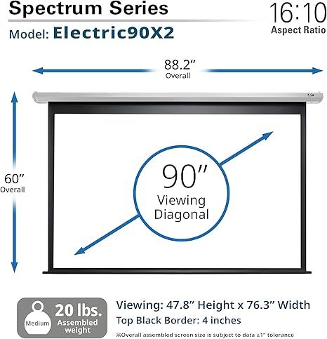 90" Diag. 16:10 Aspect Ratio. View Size: 47.7" H x 76.3" W. Overall Size: 57.7" H x 88.5" W x 3.1" D. White Case.