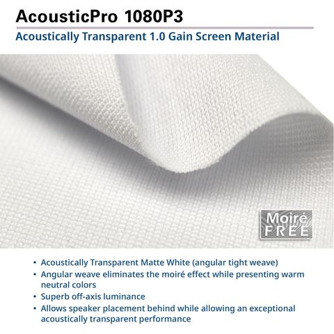 - AcousticPro 1080P3 1.0 180° AcousticPro1080P3 is an acoustically transparent front projection material. The perforated weave eliminates the moire effect while presenting warm neutral colors for today's HD 1080P (1920x1080) and 4K UHD projectors. This material allows speaker placement behind while allowing an exceptional acoustically transparent performance.