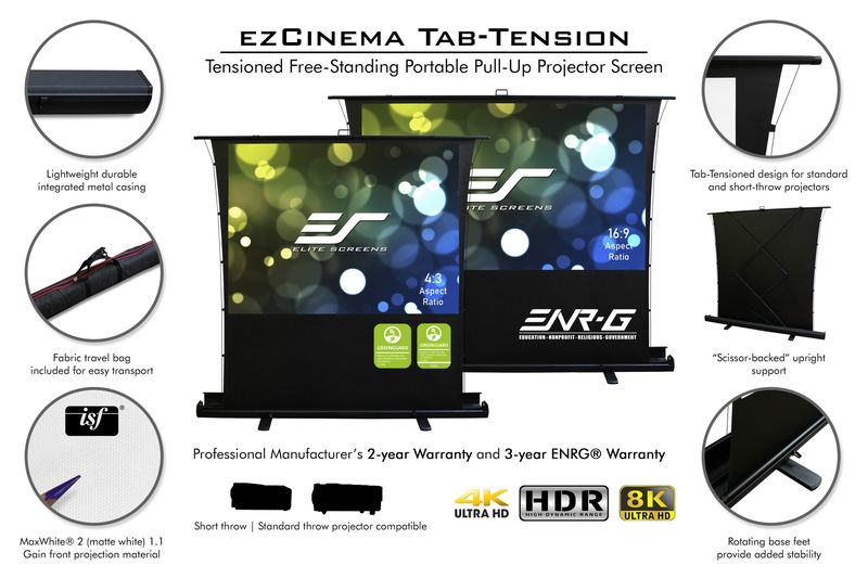 Elite Screens ezCinema Tab-Tension is a free-standing portable projection screen that is offered now with a tab-tension system. It swiftly pulls up and retracts using a "scissor-backed" free-standing mechanism that requires no extra tools, accessories or effort. This is the perfect "projector screen in a box" for portable presentations on the go. The matte white material has a wide viewing angle and is masked on all 4 sides for enhanced aesthetics and visual contrast. The screen comes with a black backing to eliminate light penetration for brighter image fidelity. The tab-tension design allows the material to be flatter on the sides for compatibility with short-throw projectors.