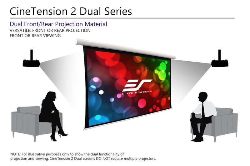CineTension 3 WraithVeil® Dual is a sturdy, well-made electric motorized projector screen that has front and rear-projection capabilities. Its tab-tensioned material provides uniform flatness for exceptional projected image clarity. The WraithVeil® Dual material presents a bright, clear image on both sides when projected upon from either angle. This versatile fabric gives optimal results under controlled room lighting while maintaining excellent performance under mild levels of ambient lighting with a high lumens (output) projector. The screen drops and retracts by means of a powerful tubular motor. Its sliding installation brackets ensure a perfectly centered installation. In addition to the installation kit, Infrared & Radio Frequency remote controls are included along with a wall box controller and 12-volt trigger capability.