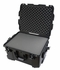 Black injection molded case with pullout handle, inline wheels, and interior dims 22" x 17" x 12.9". DICED FOAM