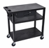 Luxor EA Series Black 3 shelf presentation station 32"W x 18"D flat shelves includes a drawer. Also includes a 3 outlet electrical assembly with 15 ft. cord. It has 33% more capacity than a standard 24"W x 18"D cart. Has an ergonomic push handle molded into the top shelf, comes with Four 4" full swivel casters, two with locking brake. Shelves and Legs are constructed with an injection molded thermoplastic resin. It has a 300 Lb. Weight capacity ( evenly distributed ).