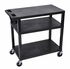 The Luxor EA Series Black 3 shelf presentation station features three 32"W x 18"D flat shelves. Includes a 3 outlet electrical assembly with 15 ft. cord. It has 33% more capacity than a standard 24"W x 18"D cart. Has an ergonomic push handle molded into the top shelf, comes with Four 4" full swivel casters, two with locking brake. Shelves and Legs are constructed with an injection molded thermoplastic resin. It has a 300 Lb. Weight capacity ( evenly distributed ).