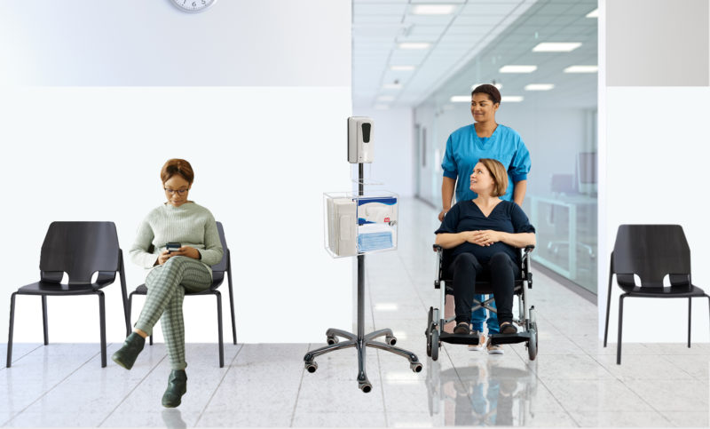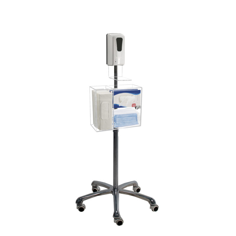 Make any public environment protected and safe with CTA Digital’s Heavy-Duty Mobile Sanitizing Station with Automatic Soap Dispenser. This ultra-durable floor stand accompanied by an acrylic glove & mask station has two slots for different size gloves and a bigger opening for masks to be hygienically pulled out by customers. The contactless automatic soap/hand sanitizer dispenser is a must have for any business. It dispenses exactly the right amount without any waste, while letting you see when it’s time for a refill through its transparent level checker. Five swivel casters attach to the chrome-plated stand base makes moving this stand a breeze.