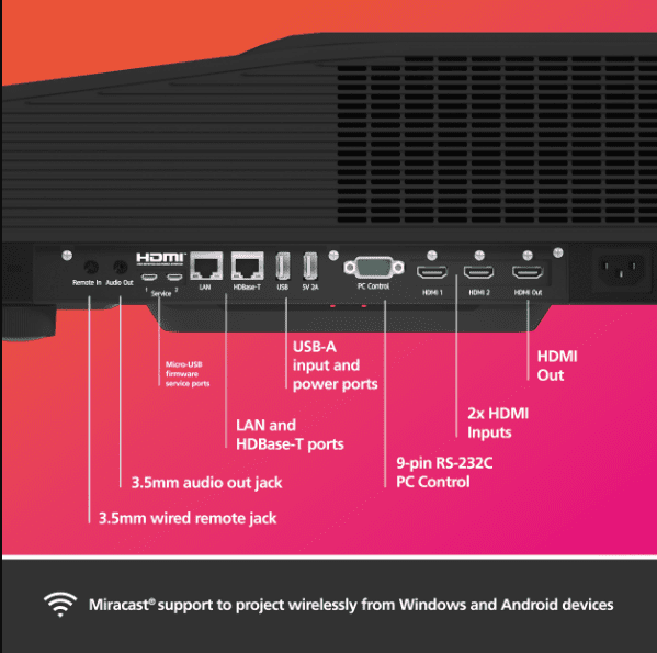 - HDMI 2.0 and HDBaseT connectivity, and wireless projection via Miracast for Windows & Android