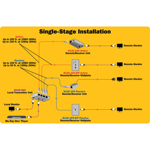 - Extends a 1080i (60Hz) signal up to 200 ft.; or, a 1080p (60Hz) signal up to 150 ft. when using 24Awg, Solid Wire Cat5e/6 cable (Tripp Lite N022-01K-GY, N202-Series, N222-01K-GY)