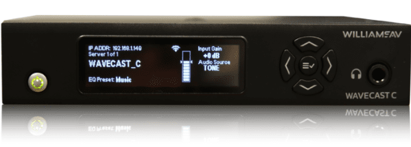 WaveCAST C is a Wi-Fi audio platform designed for pro-audio applications where high-quality sound is required. The audio is streamed to an app on personal devices or a Wi-Fi receiver, which can be used for assistive listening and other purposes. WaveCAST C integrates with third-party room systems allowing AV professionals to control with Telnet commands via Ethernet.